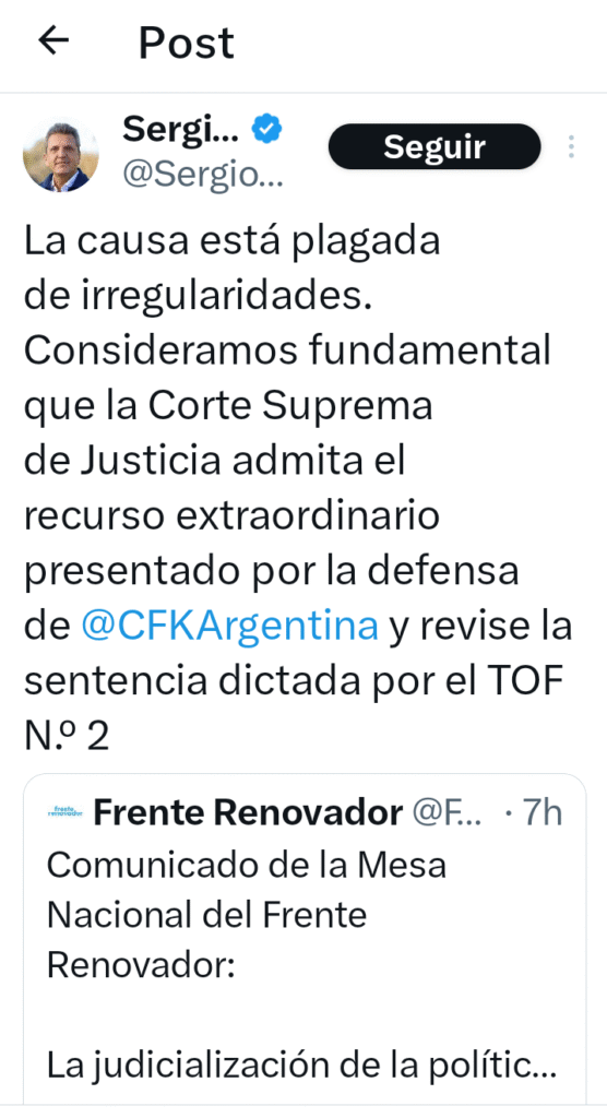 Massa escribió: “La causa está plagada de irregularidades. Consideramos fundamental que la Corte Suprema de Justicia admita el recurso extraordinario presentado por la defensa de @CFKArgentina y revise la sentencia dictada por el TOF N.º 2”.
