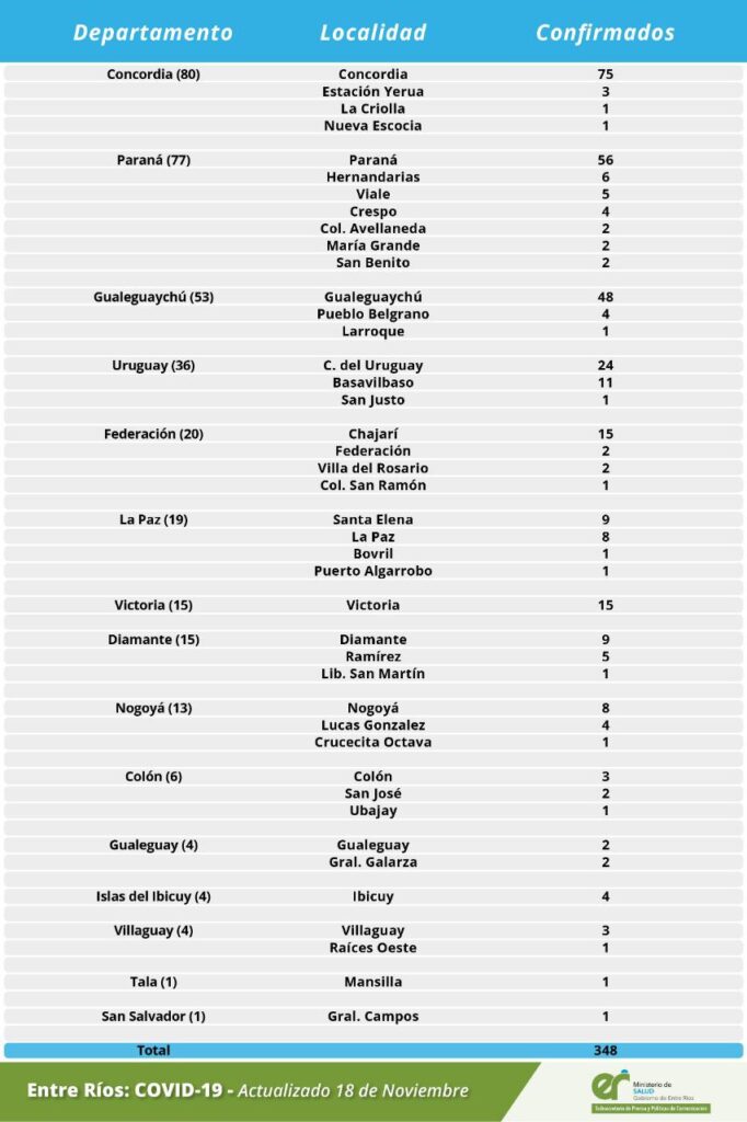 A partir de los datos reportados al 18 de Noviembre de 2020 por el área de Vigilancia Epidemiológica del Ministerio de Salud, en Entre Ríos se han sumado 348 casos de Coronavirus.