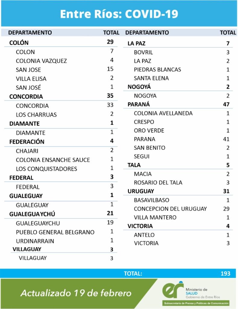 En virtud de los datos reportados al 19 de febrero de 2021 por el área de Vigilancia Epidemiológica del Ministerio de Salud, en Entre Ríos se han sumado 193 casos de Coronavirus. De ese modo, en la provincia son 45.796 los casos confirmados.
