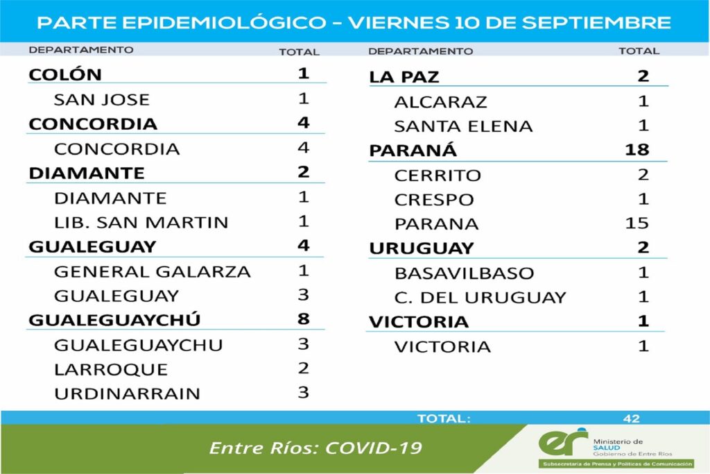 El área de Vigilancias Epidemiológica del Ministerio de Salud confirmó que en Entre Ríos este viernes 10 de septiembre se registraron 42 nuevos casos de coronavirus.