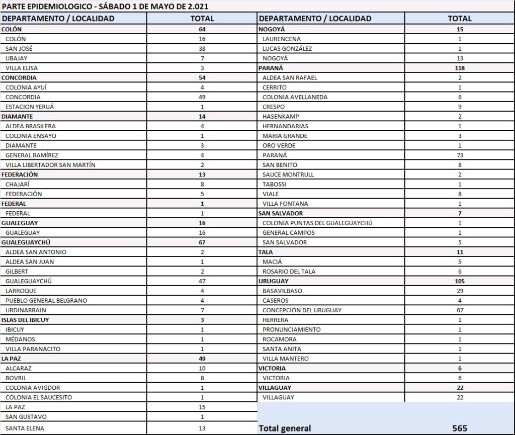 En virtud de los datos reportados este sábado 1 de mayo por el área de Vigilancia Epidemiológica del Ministerio de Salud, en Entre Ríos se han sumado 565 casos de Coronavirus