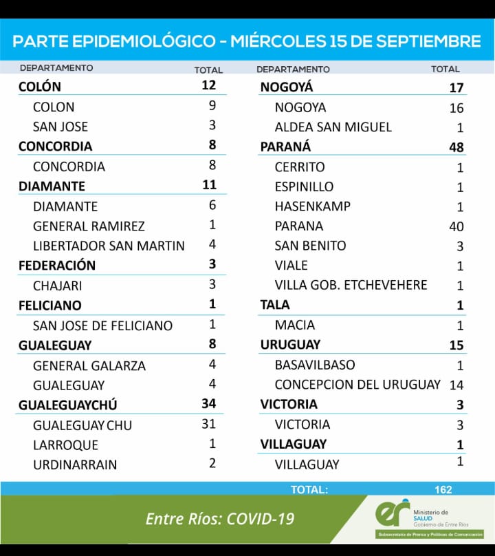 En virtud de los datos reportados por el área de Vigilancia Epidemiológica del Ministerio de Salud este miércoles 15 de septiembre, en Entre Ríos se han sumado 162 casos de Coronavirus.