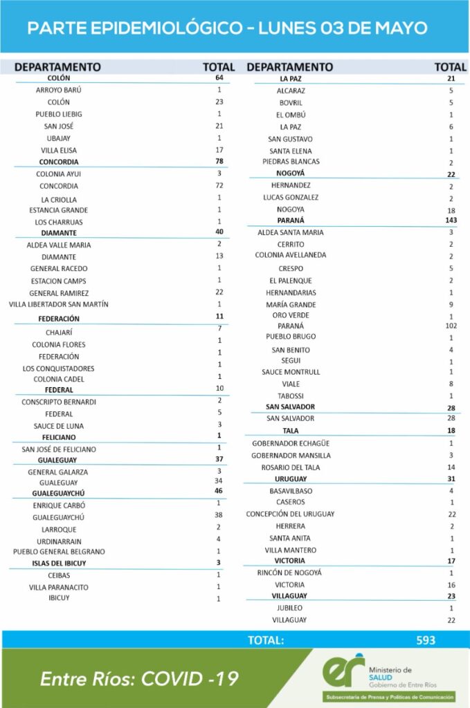 En virtud de los datos reportados por el área de Vigilancia Epidemiológica del Ministerio de Salud, en Entre Ríos se han sumado 593 casos de Coronavirus