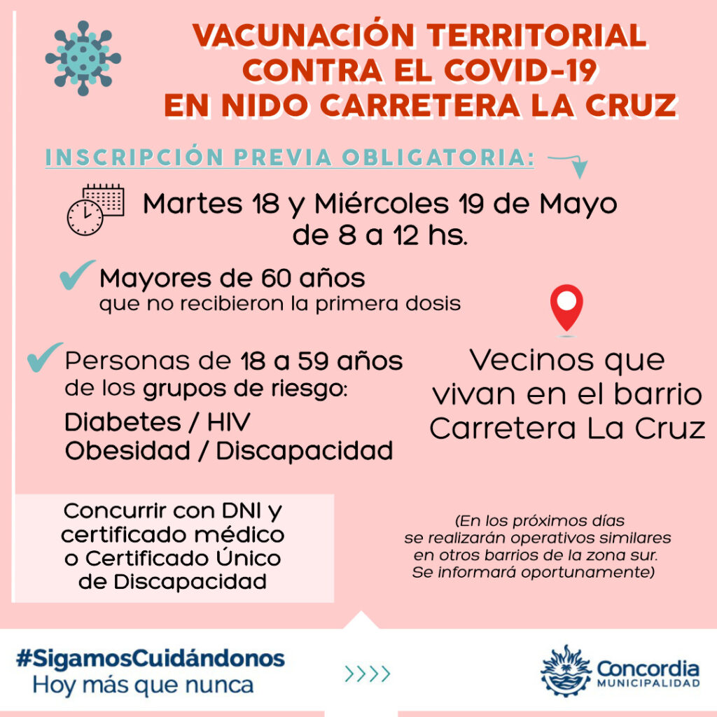 Este jueves se realizará un Operativo de Vacunación contra el Covid-19 en el NIDO del barrio Carretera La Cruz, para los vecinos de ese barrio. Los mayores de 60 años que no recibieron la primera dosis y los adultos de 18 a 59 años de los grupos de riesgo, deberán inscribirse previamente en forma obligatoria este martes y miércoles, para luego el jueves poder recibir la dosis de la vacuna.