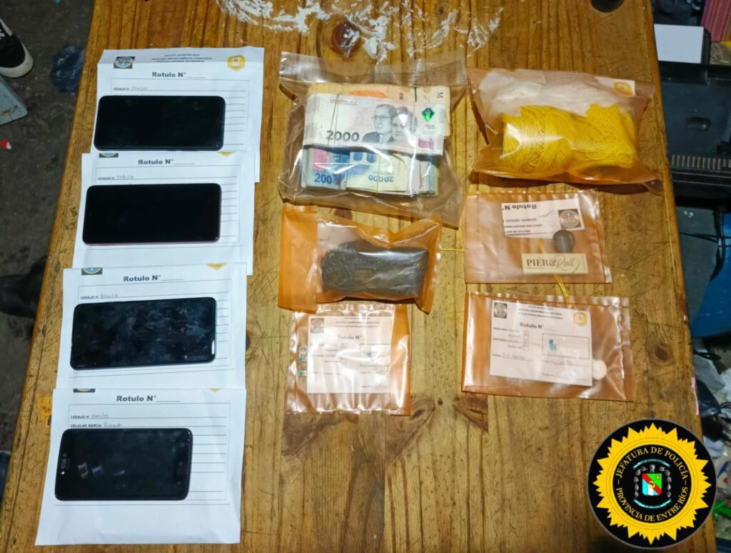 Cómo resultado del procedimiento procedieron al secuestro de: envoltorios de cocaína, envoltorios de marihuana compacta, $1.060.800 pesos en efectivo 6 teléfonos celulares y recortes de nylon quedando Detenidos y identificados tres hombres y tres mujeres.