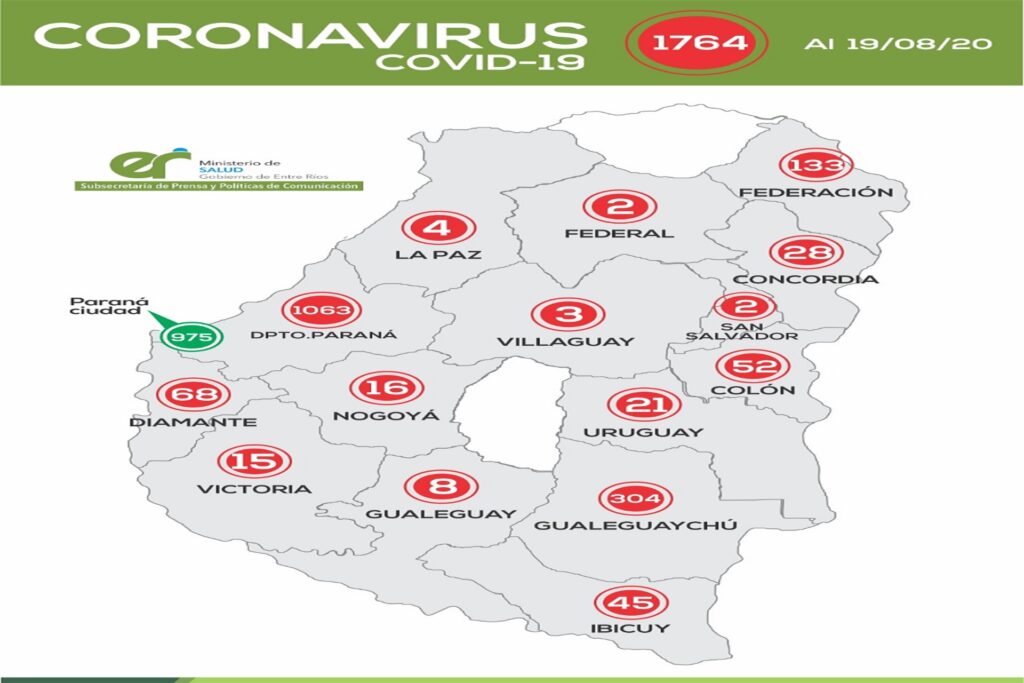 En el Departamento Uruguay se confirmaron dos casos, ambos pertenecen a la ciudad de Basalvilbaso y sus nexos epidemiológicos se encuentran en estudio.