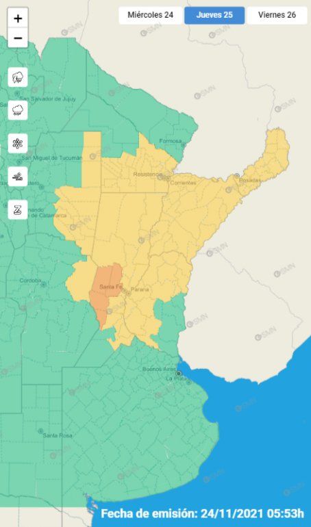 En el caso de Entre Ríos, el alerta amarillo rige para los departamentos Concordia, Federación, Federal, Feliciano, San Salvador, Diamante, La Paz, Nogoyá, Paraná, Villaguay, Gualeguay y Victoria.