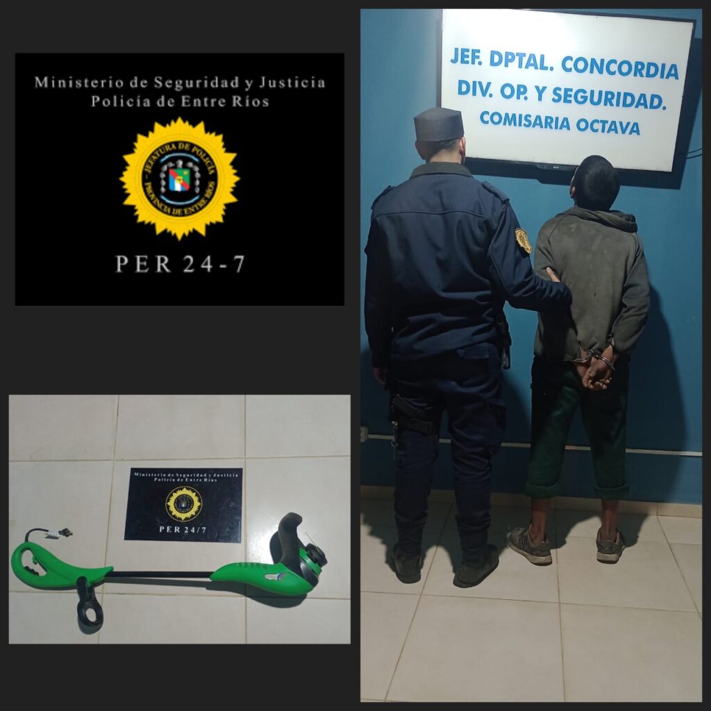 Personal policial de la Comisaría Octava, al momento de desconcentración de un operativo, siendo aproximadamente las 19:12hs. del día de ayer, en la intersección de calles Guarumba y Coronel Navarro identifican a un hombre en actitud sospechosa con un elemento electrónico. En ese instante se acercó corriendo un ciudadano de 29 años de edad, quien manifestó haber sido víctima de la sustracción de una bordeadora que se encontraba en el patio de su vivienda, reconociendo el elemento en posesión del primer sujeto como suyo.