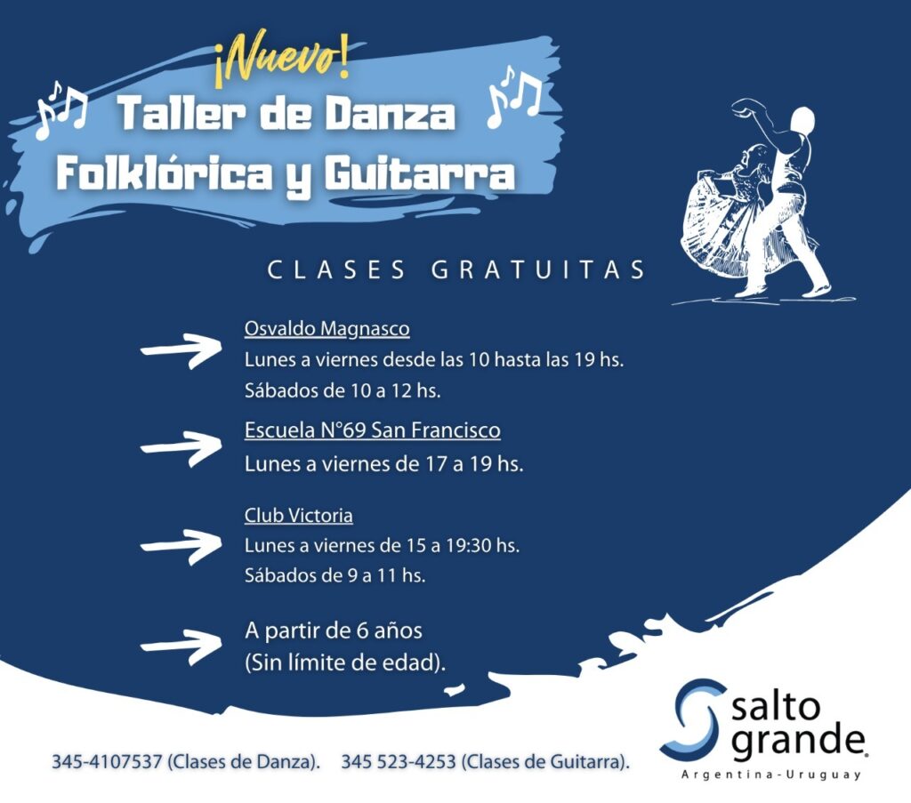 A partir de este martes, Salto Grande acerca una nueva propuesta para los vecinos de la región: Taller de Danza Folklórica y Guitarra. Los lugares donde se llevará a cabo serán el Club Victoria, Osvaldo Magnasco, en la ex estación de trenes, y la Escuela N°69 San Francisco, en una franja que contempla clases de lunes a sábados en diferentes horarios según la sede. Ambas actividades son de acceso gratuito y están destinadas a público desde los seis años en adelante, sin límite de edad.