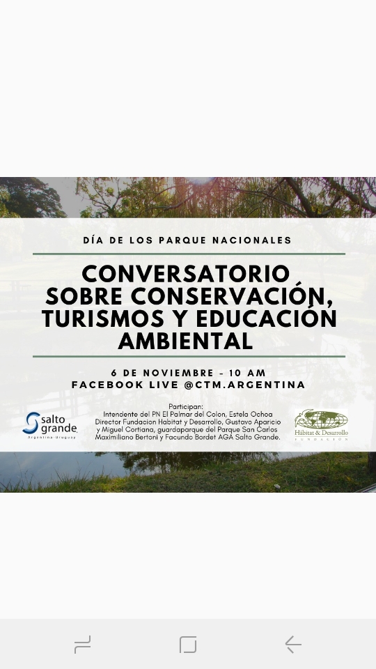 Como de costumbre, el encuentro será el viernes a partir de las 10 de la mañana por las redes sociales de la Delegación Argentina, contando con la participación de la intendenta del Parque Nacional El Palmar, Estela Ochoa, quien estará acompañada del director de la Fundación Hábitat y Desarrollo, Gustavo Aparicio y Miguel Cortiana, guardaparque del Parque San Carlos.