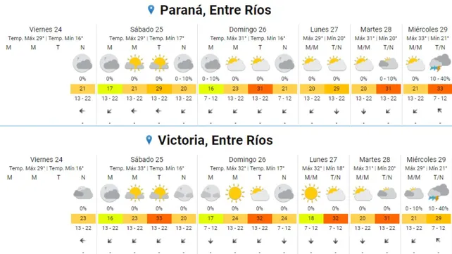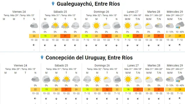 En el resto de Entre Ríos se esperan condiciones meteorológicas similares, pero con registros térmicos un poco más altas en localidades del sur. En el caso de Gualeguay y Victoria, el pronóstico del SMN indica máximas de entre 31° y 32° durante el fin de semana.