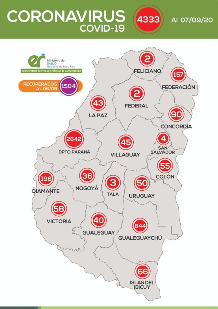 De acuerdo a los datos reportados al 7 de Septiembre de 2020 por el área de Vigilancia Epidemiológica del Ministerio de Salud, en Entre Ríos se han sumado 82 casos de Coronavirus que se distribuyen departamentalmente de la siguiente manera: