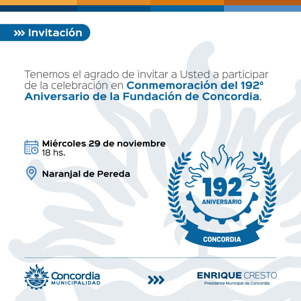 “El intendente Enrique Cresto nos encomendó invitar a todas las instituciones y a la comunidad de Concordia, porque es una de las celebración más importantes de la ciudad”, destacó al respecto el subsecretario municipal de Ceremonial y Protocolo, Sergio Olivié.