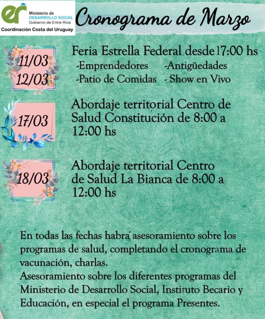 Por su parte, la coordinadora departamental del Ministerio de Desarrollo Social, Marcela Sbresso, comentó: “Es nuestro lugar y los vamos a estar esperando el 11 y el 12 de marzo, a partir de las 17. Van a participar en esta oportunidad más de 25 emprendedores de la economía social, habrá patio de comidas, shows en vivo y también habrá presencia de equipos de Salud y de Educación”. Mencionó que se ofrecerán comidas, artesanías, tejidos y vitrofusión, entre otros productos.