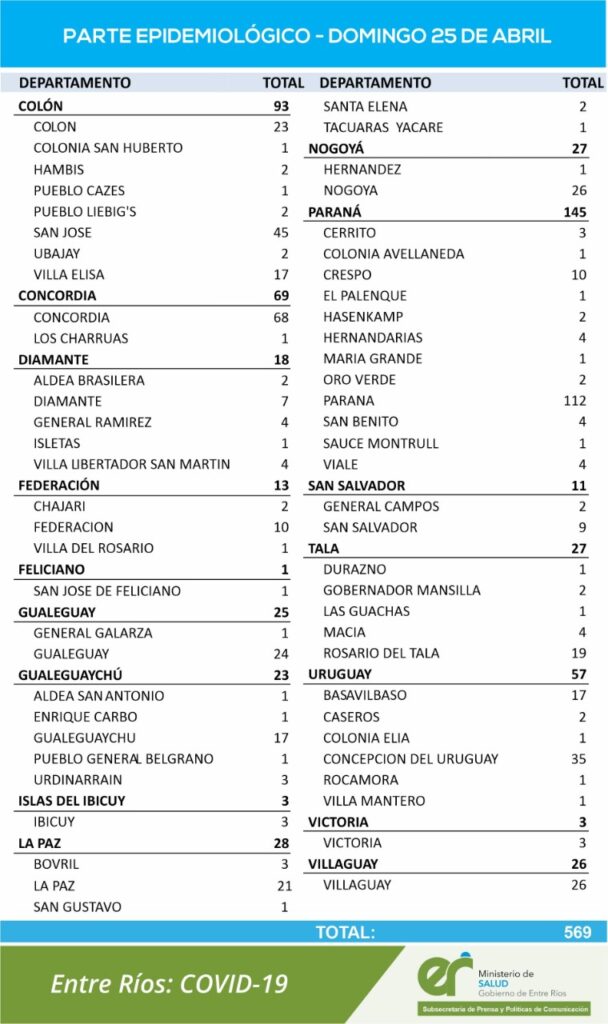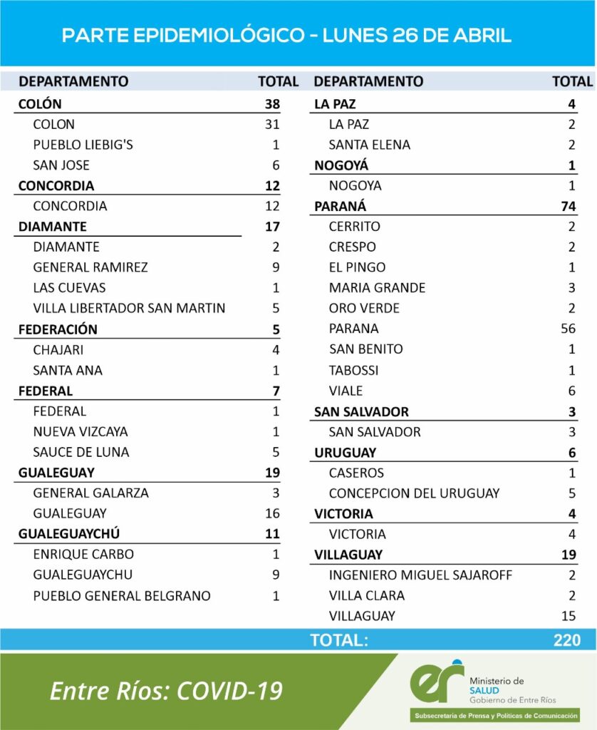En virtud de los datos reportados por el área de Vigilancia Epidemiológica del Ministerio de Salud, en Entre Ríos se han sumado 569 casos de Coronavirus al día domingo 25 de abril y otros 220 corresponden al lunes 26 de abril.