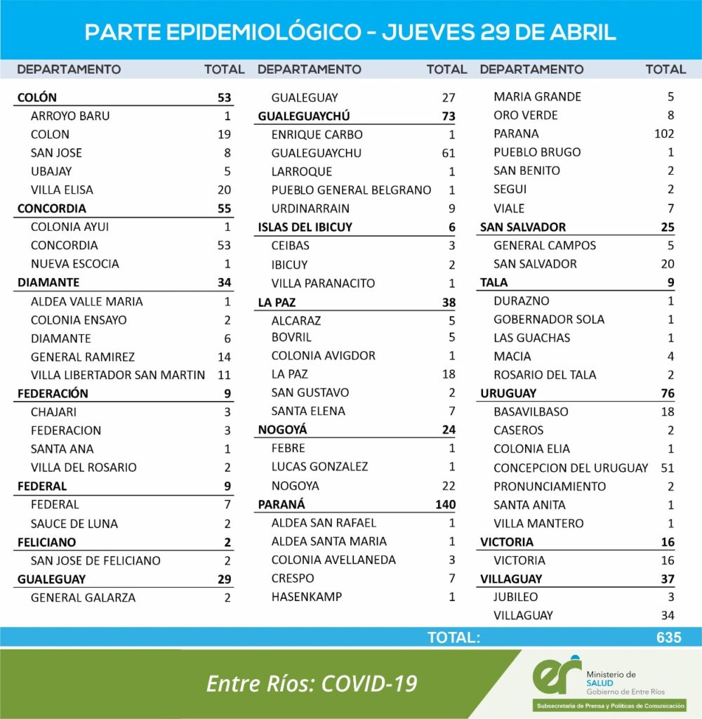 En virtud de los datos reportados este jueves 29 de abril por el área de Vigilancia Epidemiológica del Ministerio de Salud, en Entre Ríos se han sumado 635 casos de Coronavirus