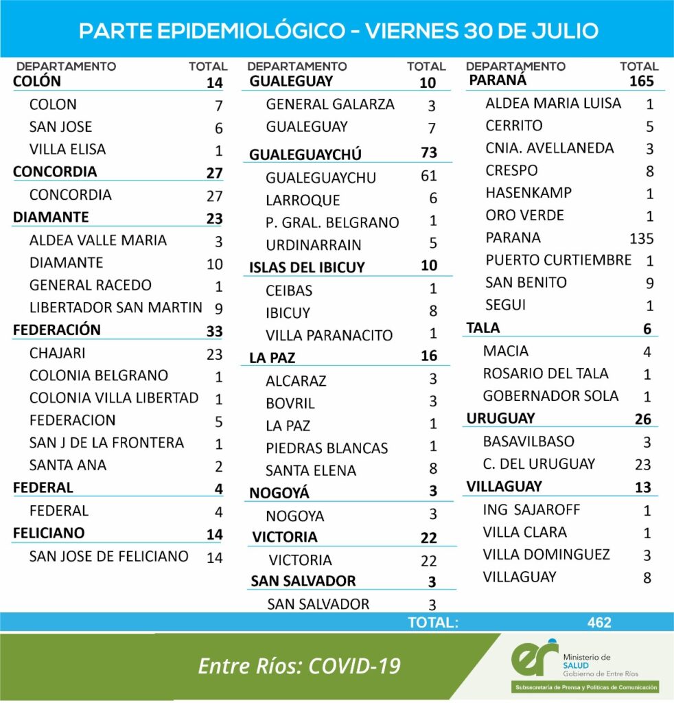 En virtud de los datos reportados por el área de Vigilancia Epidemiológica del Ministerio de Salud este viernes 30 de julio, en Entre Ríos se han sumado 462 casos de Coronavirus.