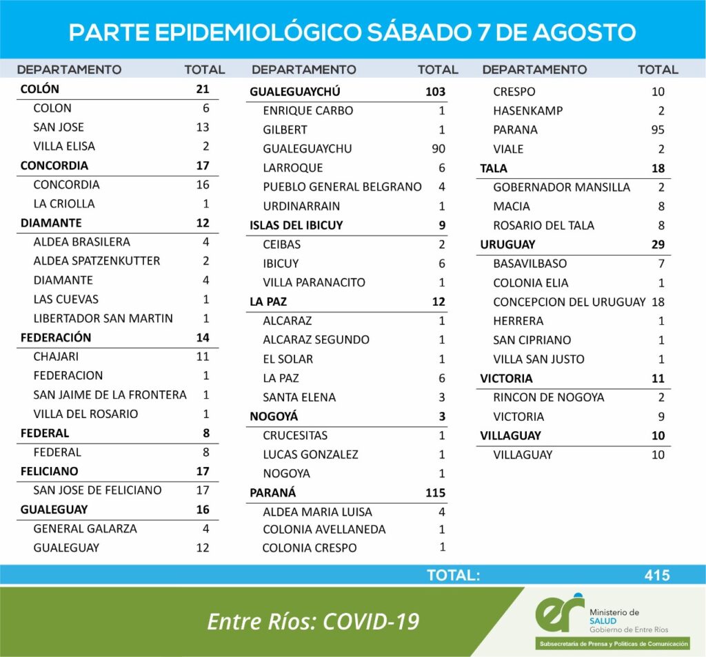 En virtud de los datos reportados por el área de Vigilancia Epidemiológica del Ministerio de Salud este sábado 7 de agosto, en Entre Ríos se han sumado 415 casos de Coronavirus.