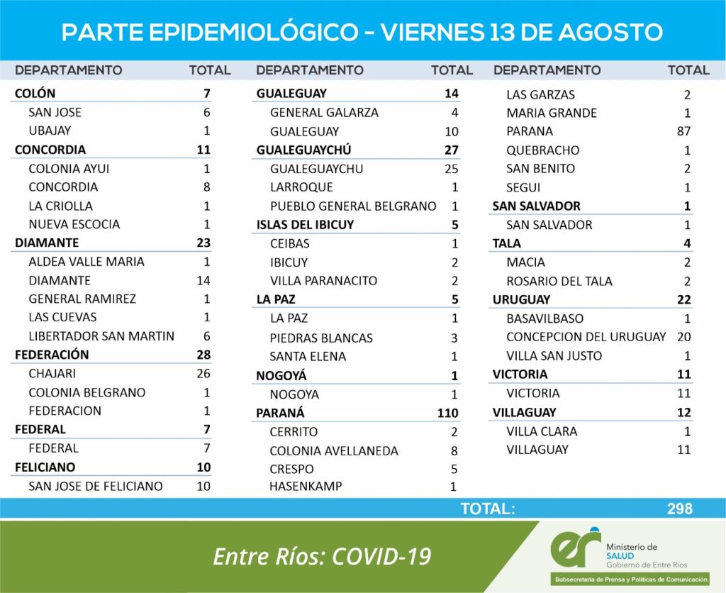 En virtud de los datos reportados por el área de Vigilancia Epidemiológica del Ministerio de Salud este viernes 13 de agosto, en Entre Ríos se han sumado 298 casos de Coronavirus.