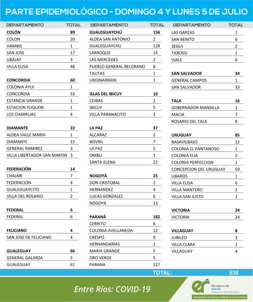 En virtud de los datos reportados por el área de Vigilancia Epidemiológica del Ministerio de Salud, en Entre Ríos se han sumado 838 casos de Coronavirus. Los mismos corresponden a la suma de dos días: 502 del domingo y 336 del lunes 5 de julio.