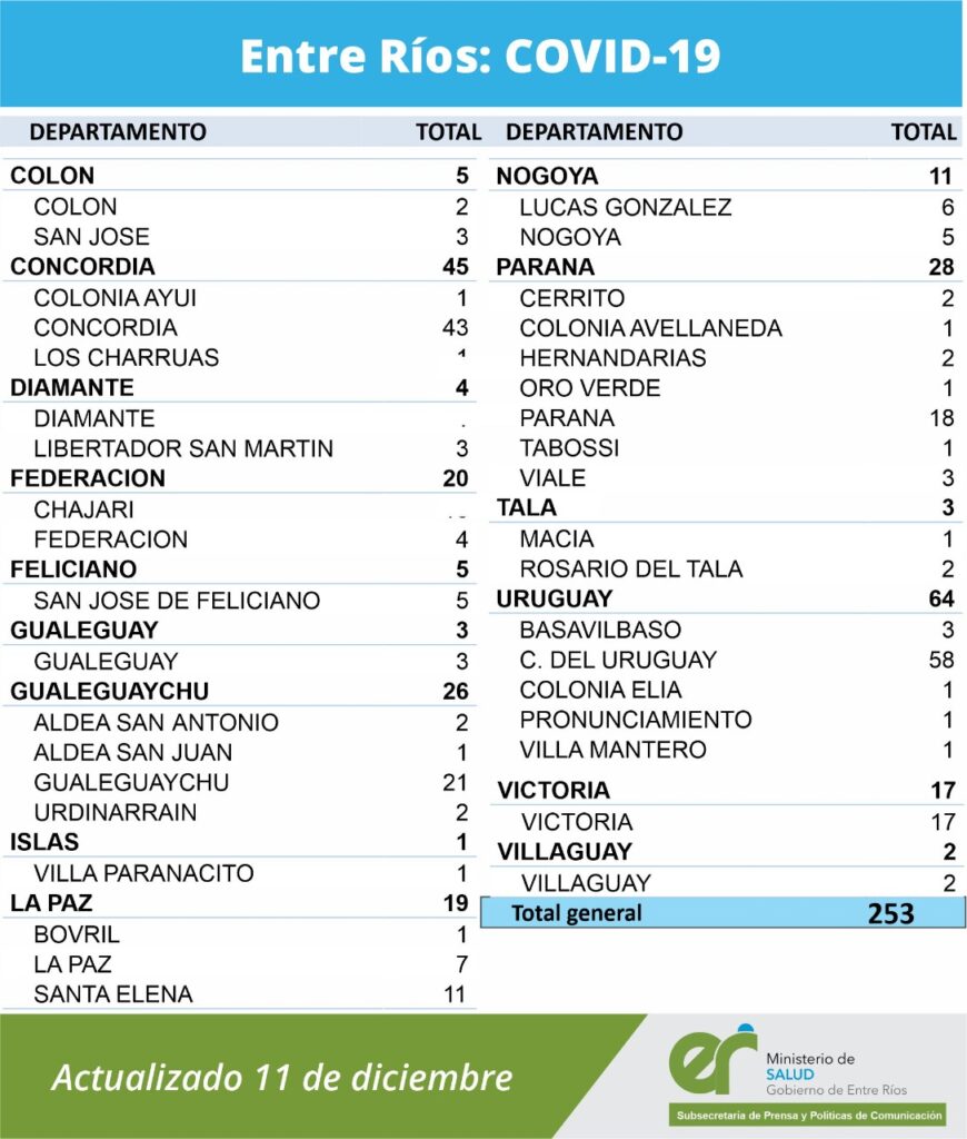 A partir de los datos reportados al 11 de Diciembre de 2020 por el área de Vigilancia Epidemiológica del Ministerio de Salud, en Entre Ríos se han sumado 253 casos de Coronavirus.