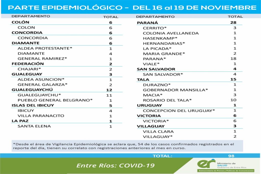 Cabe destacar que, 54 de los casos confirmados registrados en el reporte del día, tienen su correlato con registraciones anteriores al mes en curso. Dichos casos corresponden a las localidades de: Aldea Asunción (1), Aldea Protestante (1), Cerrito (3), Chajarí (1), Concepción del Uruguay (1), Durazno (1), General Galarza (1), General Ramírez (1), Gobernador Mansilla (1), Gualeguaychú (7), Hasenkamp (1), Hernandarias (1), La Picada (1), Macia (3), María Grande (1), Paraná (10), Pueblo General Belgrano (1), Rosario del Tala (10), San Salvador (1), Viale (1), Victoria (5), Villaguay (1).