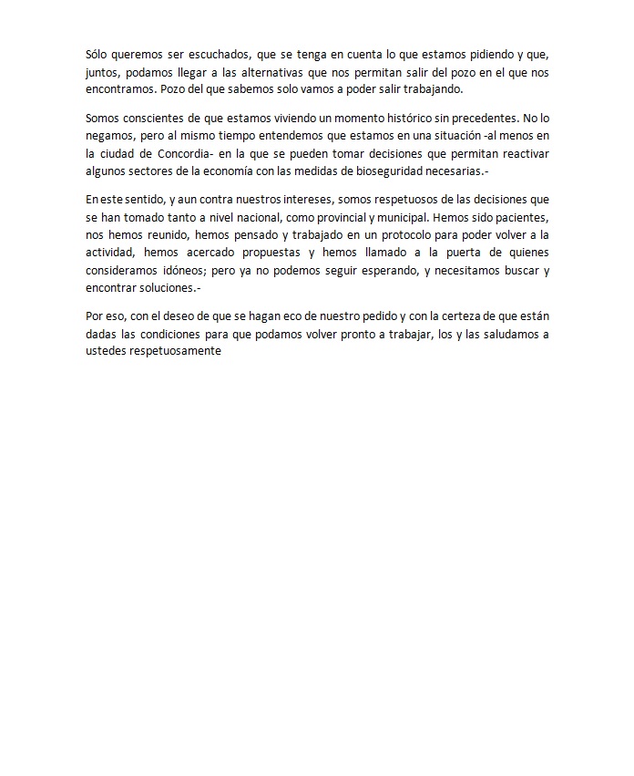 “Somos ciudadanos cuya fuente de trabajo ha sido arrebatada, cuya capacidad de sustento ha sido anulada por este cese forzoso que entendemos necesario pero que nos ha llevado a esta situación extrema en que muchas veces las necesidades básicas no se encuentran cubiertas” manifiestan.