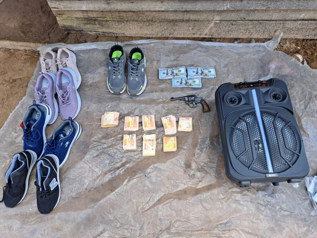 En el lugar se Notificó de la medida a un masculino de 30 años. Como resultado del Procedimiento, se logró el Secuestro de: un Revólver calibre 32 largo con tambor de Seis alveolos conteniendo tres Cartuchos, varios pares de zapatillas; un Bafle portátil; la suma de USD18.600 y la suma de $161.000 en moneda nacional.