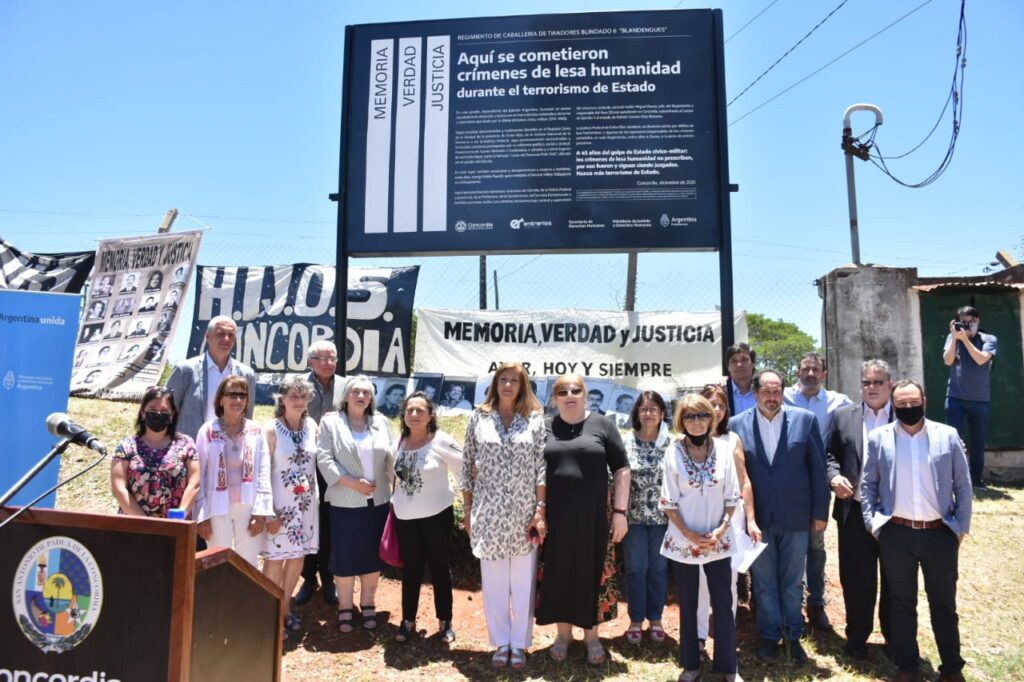 Al mediodía de este martes se desarrolló en la intersección de calles Arruabarrena y Belgrano, de la localidad de Concordia, la señalización de la Caballería de Tiradores Blindado 6 “Blandengues”, lugar donde funcionó un centro clandestino de detención y tortura, en el marco del plan sistemático de terror y exterminio ejecutado por la última dictadura Cívico-Militar (1976-1983).