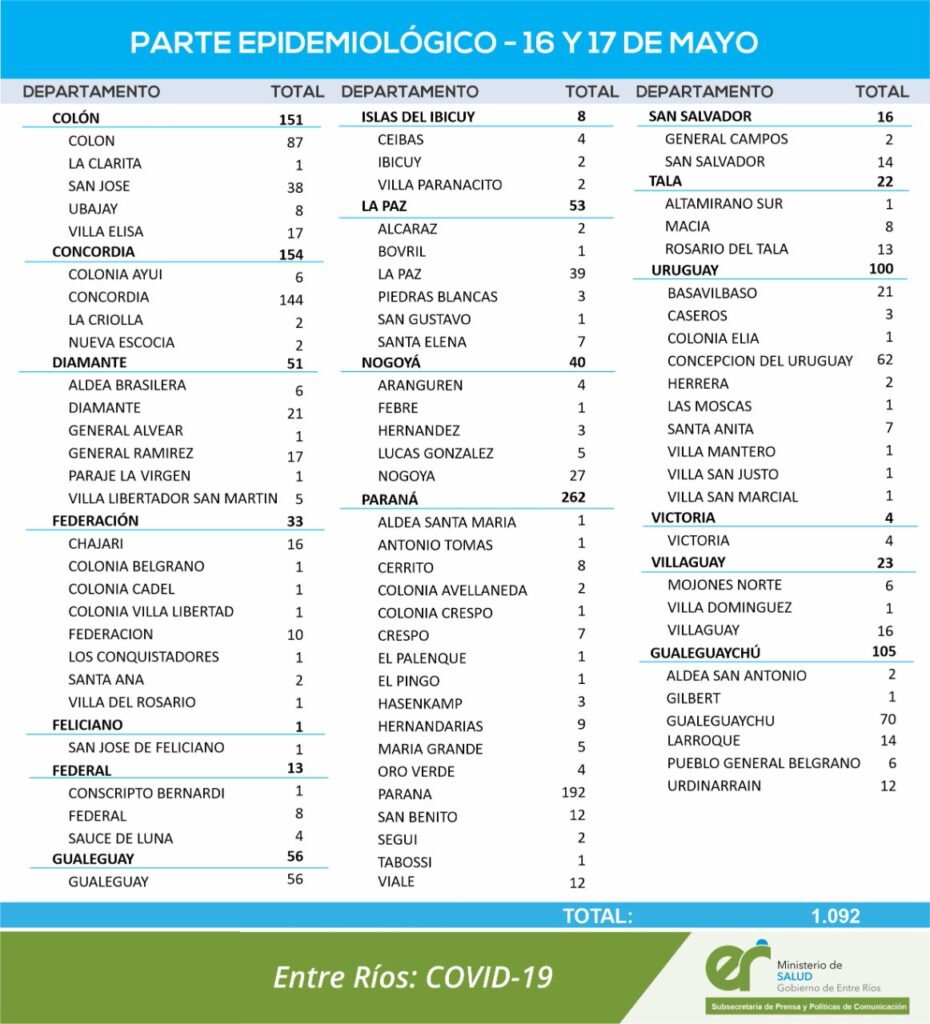 En virtud de los datos reportados por el área de Vigilancia Epidemiológica del Ministerio de Salud, en Entre Ríos se han sumado 1092 casos de Coronavirus. Los mismos corresponden a la suma de dos días: 691 del domingo y 401 casos del lunes 17 de mayo.