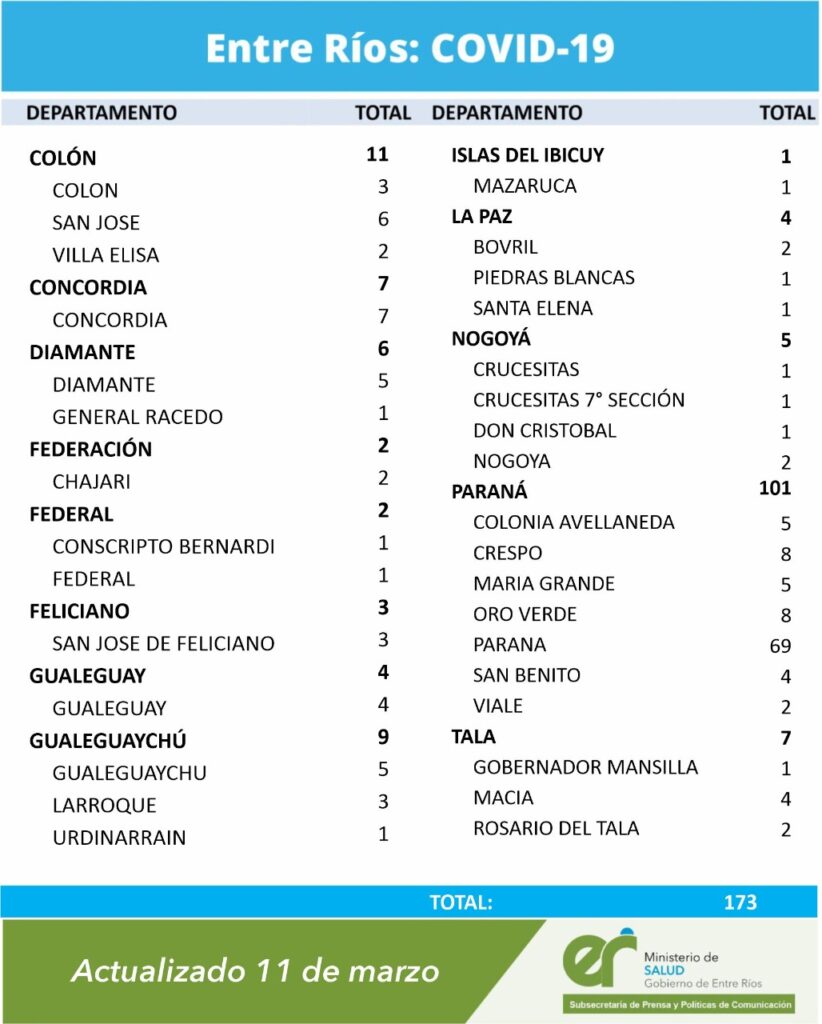 En virtud de los datos reportados al 11 de marzo de 2021 por el área de Vigilancia Epidemiológica del Ministerio de Salud, en Entre Ríos se han sumado 173 casos de Coronavirus.