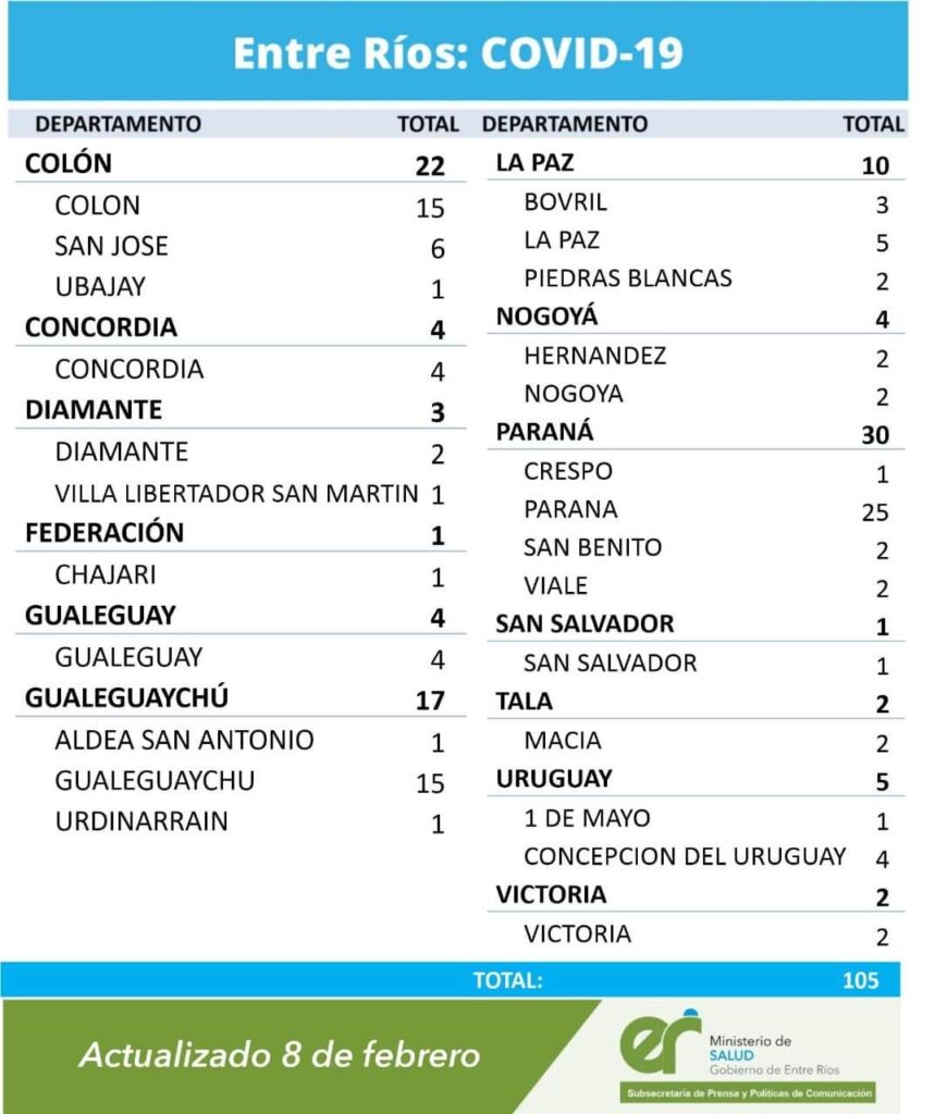 En virtud de los datos reportados al 8 de febrero de 2021 por el área de Vigilancia Epidemiológica del Ministerio de Salud, en Entre Ríos se han sumado 105 casos de Coronavirus.