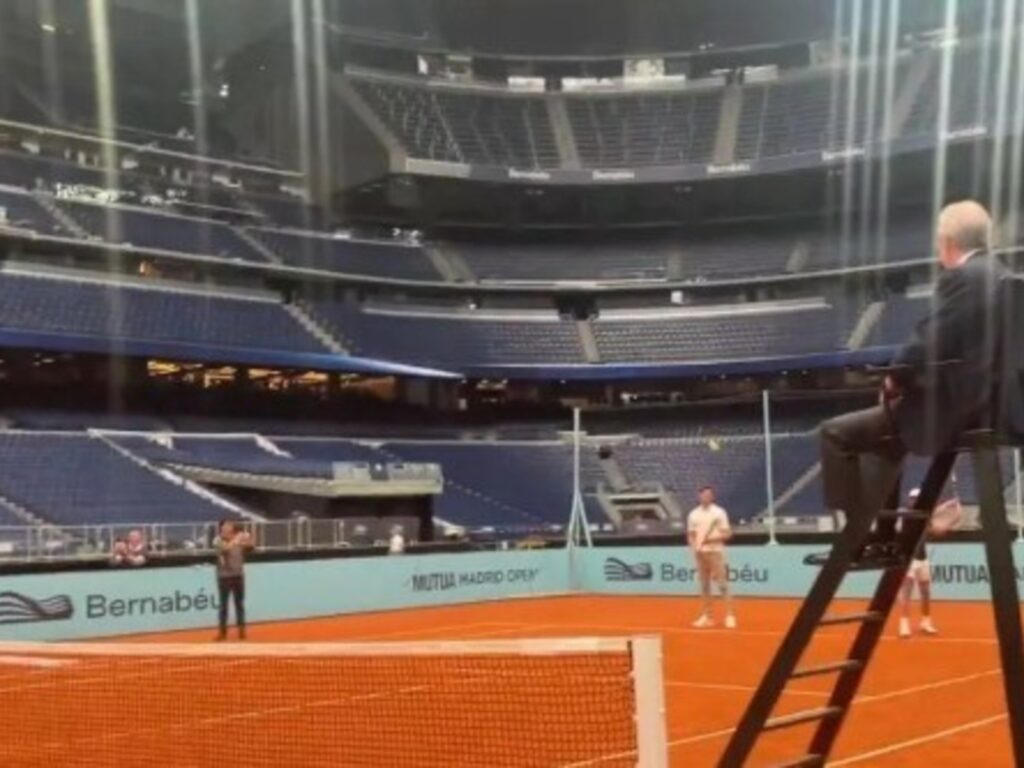 El estadio del Real Madrid cambió de deporte por unos días. El Santiago Bernabéu dejó atrás el césped y comenzó a transformarse en una cancha de tenis para el Masters 1000 de Madrid. En plena instalación de la pista de tierra batida del Mutua Madrid Open, el estadio del Real Madrid dejó una de las imágenes más llamativas de la temporada: un minipartido con figuras de primer nivel y la participación inesperada de su presidente.