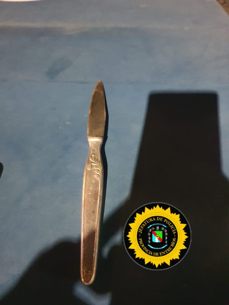 A la brevedad, un móvil policial interceptó a las agresoras en la intersección de Presidente Illia y Laprida, aún en posesión del cuchillo y el termo robado.