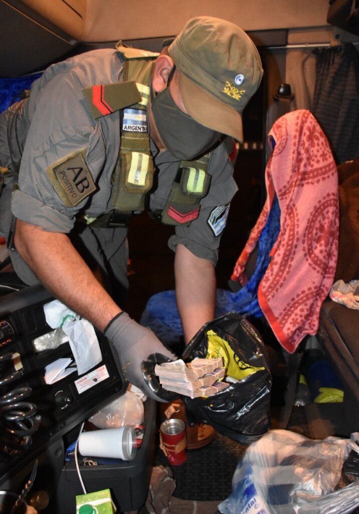 Inmediatamente, los uniformados llevaron a cabo la requisa de los vehículos, constatando rápidamente que en el interior de ambas cabinas había fajos billetes de moneda nacional de curso legal que eran transportados sin la documentación necesaria que respalde su origen.