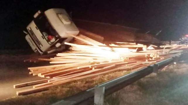 Por lo tanto, se realiza un desvío hacia la mano contraria y se recomienda precaución a los conductores que transiten por la zona. El vehículo accidentado transportaba maderas y debido al vuelco se desparramó parte de su carga. La circulación por el lugar registra también algunas demoras.