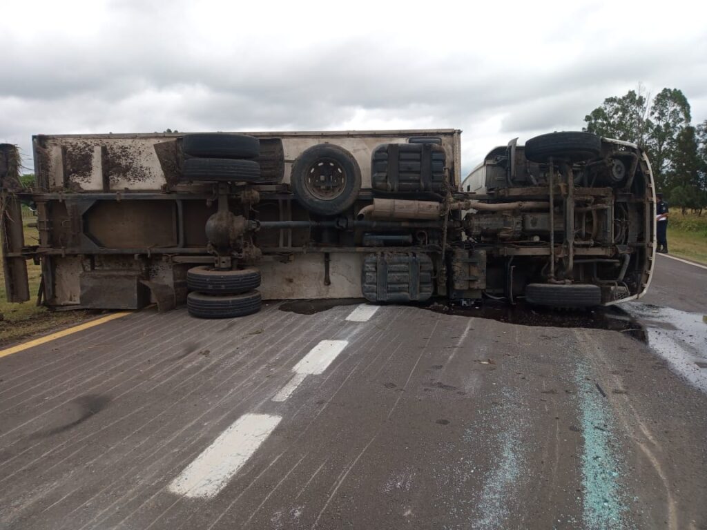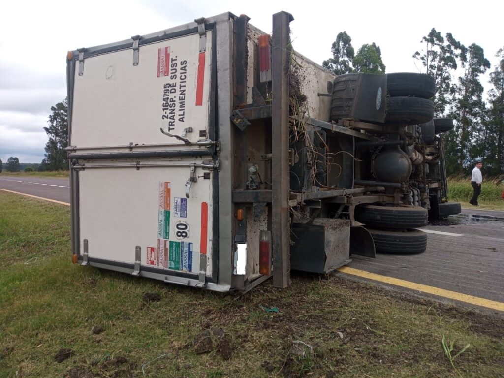 Personal Policial de Comisaría de Colonia Yeruá se constituyó en el Km 235 de la Ruta 18, donde se constató el vuelco de un camión que transportaba lácteos.