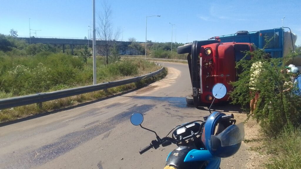 Durante el mediodía de este viernes, alrededor de las 12 hs, personal de Comisaría Séptima y Destacamento de Colonia Roca resultan comisionados al acceso de Ruta 4 y 14, ante la toma de conocimiento de un camión volcado sobre la curva de ingreso.