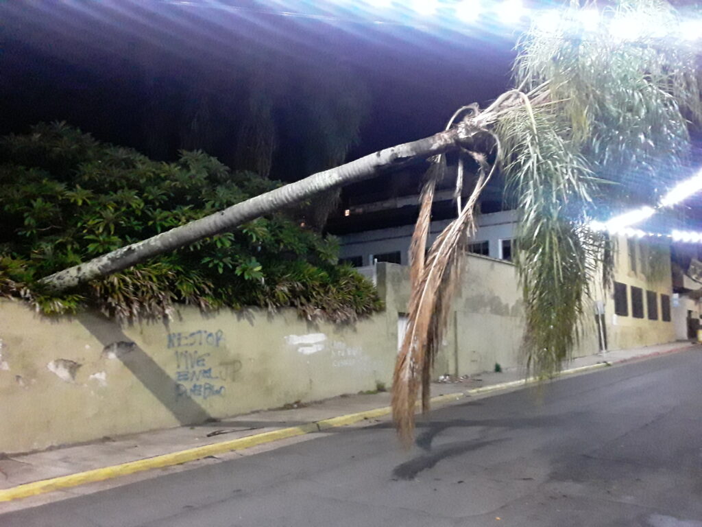 En la noche de este lunes, debido a los fuertes vientos que azotaron a nuestra ciudad, una palmera de gran porte cayó desde el interior del club Progreso hacia calle Salta.