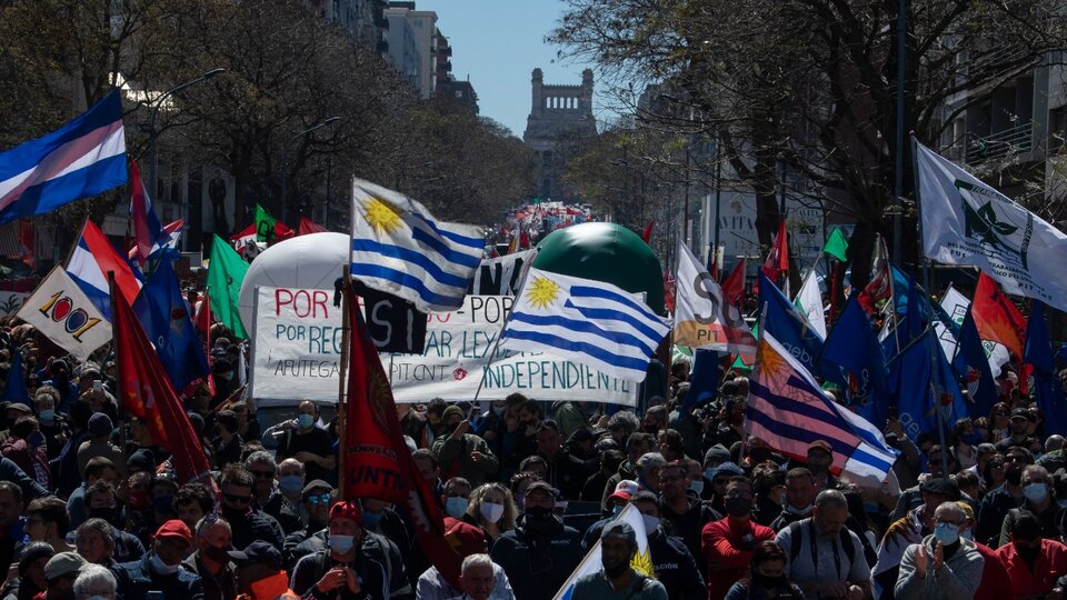 La avenida del Libertador hacia el Palacio Legislativo que se levanta en el barrio de La Aguada se había transformado en un mosaico multicolor y a la vez compacto. Las imágenes de Mario Benedetti, Juana de Ibarbourou y Alfredo Zitarrosa observaban desde un mural cercano al Congreso pintado sobre la plaza Plaza Michelini – Gutiérrez Ruiz. Ese espacio público remodelado homenajea a los dos legisladores uruguayos asesinados en Buenos Aires en 1976 en el marco del Plan Cóndor. Forma parte de un corredor cultural que rodeó a la movilización, la más importante en una década que convocó la central de trabajadores uruguaya.