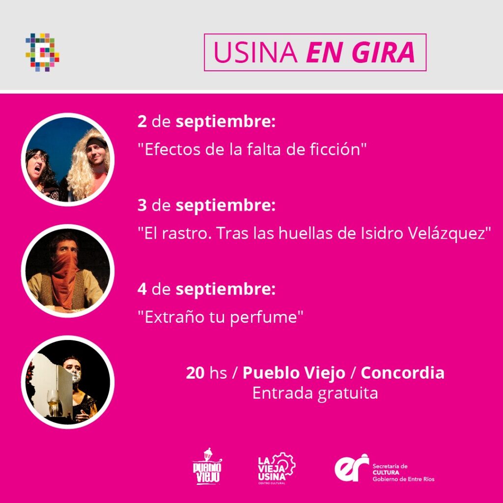 Usina en gira: tres días de teatro entrerriano en Concordia Desde el C.C. y C. La Vieja Usina, dependiente de la Secretaría de Cultura de Entre Ríos, se propone un proyecto de circulación con los cuatro espectáculos entrerrianos seleccionados en Fiesta Provincial de Teatro Entre Ríos 2021 para participar del Encuentro Regional Centro Litoral: “Cuenca. Todo debajo”, “Efectos de la falta de ficción”, “El rastro. Tras las huellas de Isidro Velázquez”, y “Extraño tu perfume”. La intención es aportar a la formación de públicos teatrales en distintas localidades del territorio provincial, favoreciendo además el intercambio entre hacedores teatrales de distintas regiones de la provincia. La primera experiencia se llevará adelante en Concordia, en el Espacio Cultural Pueblo Viejo (Alem 230), donde el Colectivo Las Cuencas, recibirá a los grupos Agua Viva de Gualeguay y Teatro del Bardo de Paraná. El día 2 de septiembre se presentará “Efectos de la falta de ficción”, una obra multimedia, que combina diferentes lenguajes para dar cuenta de manera humorística del derrotero de los meses de pandemia. El 3 de septiembre será el turno de “El rastro. Tras las huellas de Isidro Velázquez”, una historia de rebeldía ante la injusticia, la pobreza y la opresión. El 4 de septiembre, cerrará el ciclo la obra “Extraño tu perfume”, un espectáculo unipersonal inspirado en textos no dramáticos de la literatura queer – trans contemporánea y en la biografía del actor. Después de cada función se propiciará un espacio de intercambio entre artistas y público.