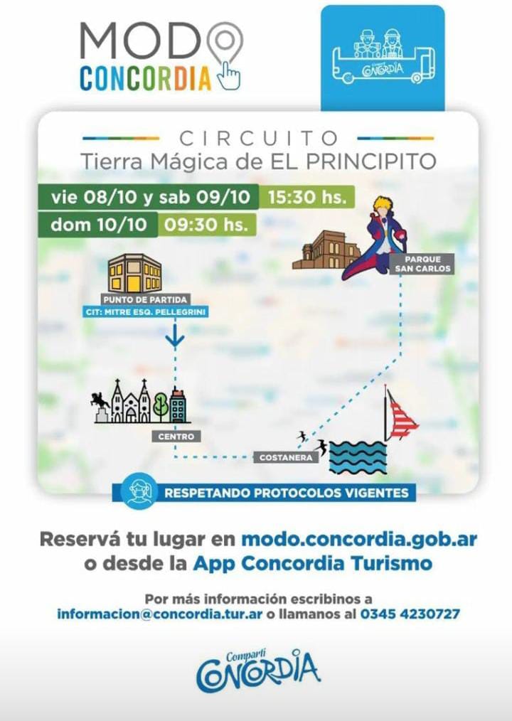 Asimismo, la Secretaría de Turismo invita a conocer la Tierra Mágica de El Principito con un atractivo paseo en el Bus Turístico. Los recorridos se realizarán en diferentes horarios los viernes, sábado y domingo partiendo del Centro de Información Turística Para realizar las reservas se puede consultar al 0345 4230727 o a través de la APP “Concordia Turismo”.