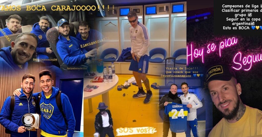 El capitán Carlos Izquierdoz, en una noche que lo tuvo como una de las grandes figuras, compartió una foto que se sacó arriba del micro junto a Benedetto, Javier García, Nicolás Orsini y Agustín Rossi. “Vamos Boca carajoooo!!!”, escribió Cali. También publicó una foto con el piloto Agustín Canapino, a quien le regaló la número 24 azul y oro, y agregó una historia del cantante Emi Brancciari en la tribuna.