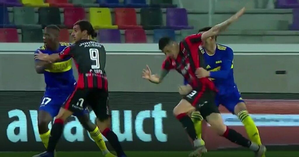 También se da en un tiro de esquina, esta vez ejecutado desde el otro lado. La enorme mayoría de los jugadores van a buscar el centro el primer palo y la pelota los sobrepasa. Cae al segundo palo, y con ella cae también Sebastián Sosa Sánchez. Es Advíncula el que empuja al delantero de Patronato. Y lo hace por desentenderse de la pelota: corre al rival y lo toma sin siquiera mirar hacia dónde va el esférico. Su único objetivo es sacarlo de la jugada y entonces, cuando Sosa Sánchez frena en busca del balón, el peruano se lo lleva puesto. Penal. Pero penal no sancionado.