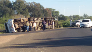 Un camión que circulaba de Norte A Sur por la autovía “José Gervasio Artigas”, volcó esta mañana en la rotonda de acceso a Chajarí.