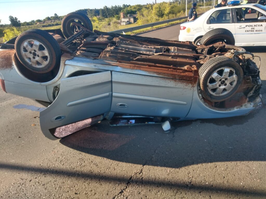 Funcionarios de Comisaría de La Criolla, en la tarde de la víspera tomaron conocimiento sobre un vuelco que se produjo en la Autovía G. Artigas y Ruta Prov. Nº4, una vez en el lugar pudieron observar a un auto volcado, siendo éste de marca CHEVROLET-Corsa, se encontraba sobre la cinta asfáltica sentido N/S en el Km-261. El rodado era conducido por un hombre de 74 años oriundo de la Prov. de Bs. As. (Único ocupante), según los relatos por él, fue que trató de esquivar a un perro que se le cruzó perdiendo el control. El hombre fue trasladado hasta el Hospital Masvernat debido a un corte en el cuero cabelludo, (fuera de peligro).-
