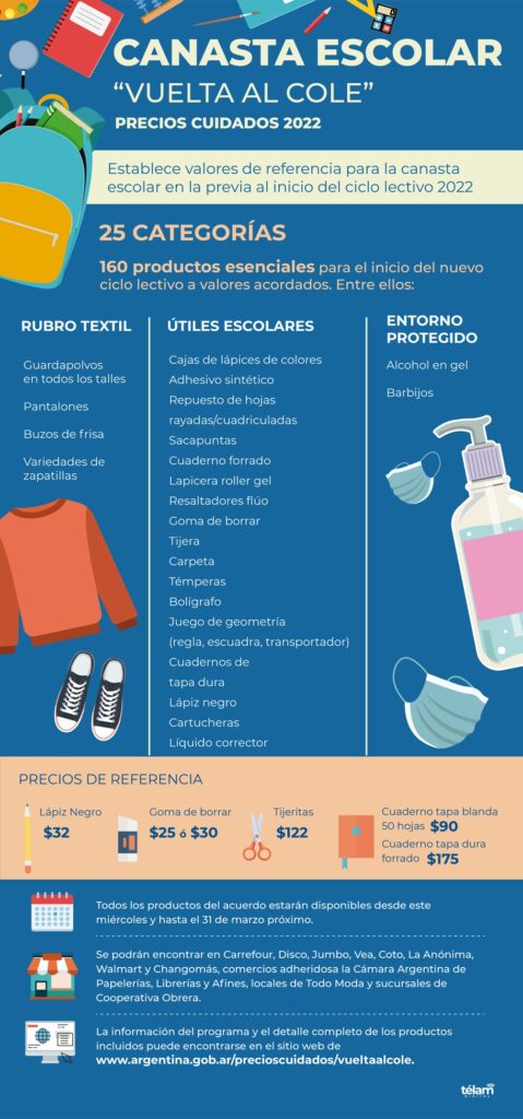 La Secretaría de Comercio Interior lanzó el programa Vuelta al Cole con +Precios Cuidados 2022, que establece valores de referencia para la canasta escolar frente al inicio del nuevo ciclo lectivo, e incluye más de 160 productos de 25 rubros, que se ofrecen desde este miércoles y hasta el 31 de marzo, tanto en librerías comerciales como en grandes cadenas de supermercados en todo el país.